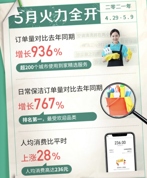 随着人们对生活品质的要求不断提升,越来越多家庭希望摆脱传统的家务束缚,上门保洁、家电清洗等需求迎来爆发增长。围绕用户需求,58同城到家精选在五一小长假期间开启“神奇家务节”活动(4月29日-5月9日),在多重优惠刺激下,活动期间平台订单量较去年同期增长936%,人均消费较平日上涨28%,消费者家政服务需求集中释放。