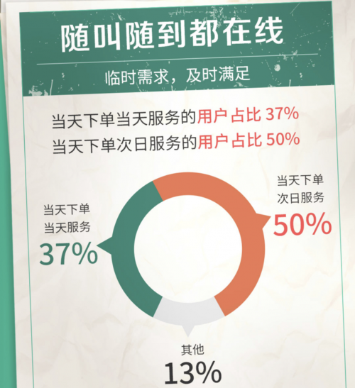 除了家政服务支出大幅增加,越来越多消费者有即时性服务需求。报告显示,当天下单当天服务的用户占比为37%,用户好评率高达97%;当天下单次日服务的用户占比50%,好评率达96%。反映了在互联网时代,用户对于家政服务随叫随到有了更高的要求。